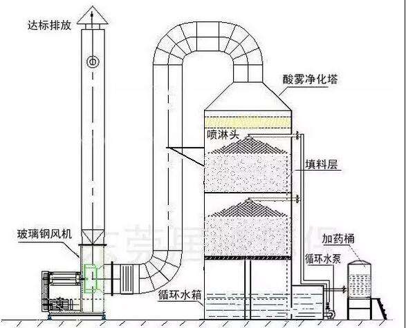 硫酸、硝酸、氢氟酸、盐酸等工艺操作过程中产生性气体,废气通过引风机的动力进入填料塔。当有一定进气速度的酸性气体经进气管进入酸雾处理塔后,设备的冲击水层改变了气体的运动方向,而气体由于惯性则继续按原方向运动,其中大部分尘粒与水粘附后便停留在水中,在冲击水浴后,有一部分尘粒随气体运动,与冲击水雾并与循环喷淋水相结合,在主体内进一步充分混合,起到中和作用。填料塔对酸、碱性废气净化采用多级旋转式喷淋、吸收,吸收液均匀分布在填料上。